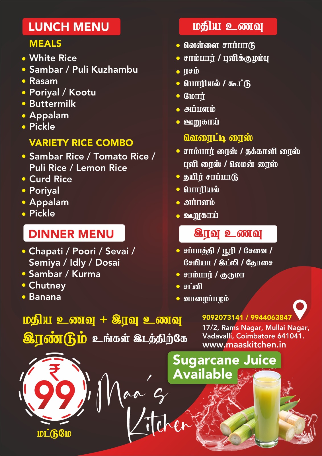 Every dish feels like it’s made with love. From the rasam to the side dishes, Maa's Kitchen has captured the essence of traditional Tamil Nadu flavors beautifully.